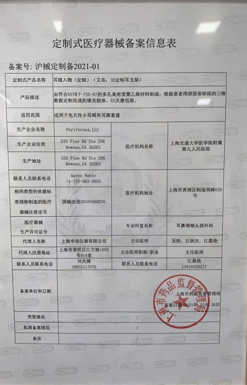 为支持医院使用三维一体化定制耳植入物,今年3月,按照国家《定制式医疗器械监督管理规定》,上海市药监局向上海九院发放了“耳植入物(定制)”备案凭证(沪械定制备2021-01)。备案不再对产品进行审批,但强调企业和医院的能力,强调已有同类标准产品批准上市,强调备案后监管。备案替代审批,缩短产品上市时间,为临床应急使用和创新发展开出绿色通道。