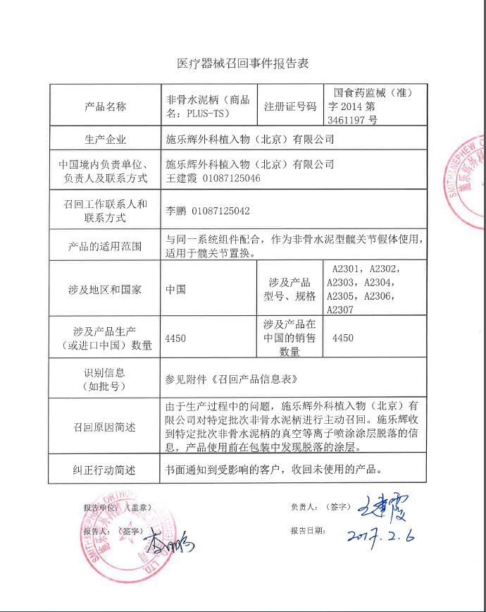 施乐辉外科植入物(北京)有限公司对非骨水泥柄(商品名:PLUS-TS)主动召回
