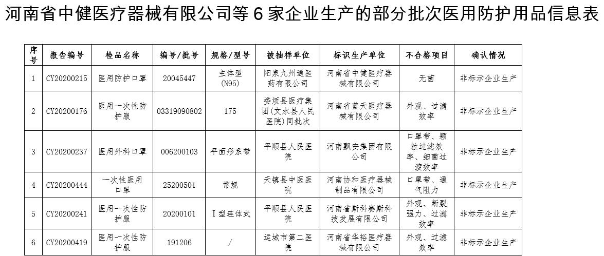我局在2020年医疗器械质量抽检中,抽取标示为河南省中健医疗器械有限公司生产的医用外科口罩;河南协和医疗器械制品有限公司生产的一次性医用口罩;河南华裕医疗器械有限公司生产的医用一次性防护服;河南飘安集团有限公司生产的医用外科口罩;河南斯科塞斯科技发展有限公司生产的一次性防护服;河南省蓝天医疗器械有限公司生产的医用一次性防护服。详细信息见附件。上述产品经山西省医疗器械检测中心检验,部分项目不符合标准规定。经我局协查河南省药品监督管理局回函确认,全部为非标示企业生产,存在重大质量安全风险。抽样地药品监督管理部门正在进行立案调查。