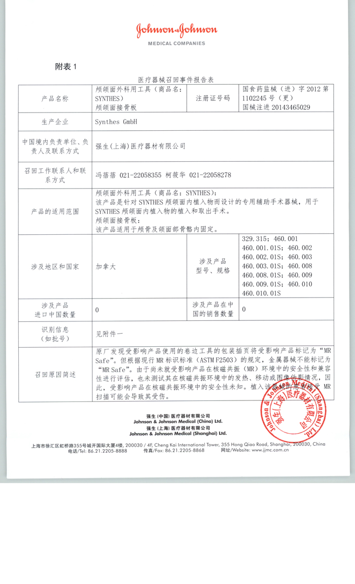 强生(上海)医疗器材有限公司报告,该公司代理的颅颌面外科用工具(商品名:SYNTHES) (注册证号:国食药监械(进)字2012第1102245号(更))和颅颌面接骨板(商品名:Synthes)(注册证号:国械注进20143465029),由于以上产品的卷边工具的包装插页标记有误,其生产商Synthes GmbH对该产品进行主动召回。该公司称本次召回产品未在中国销售。请各省、自治区、直辖市食品药品监督管理局加强对此类产品的监督管理。