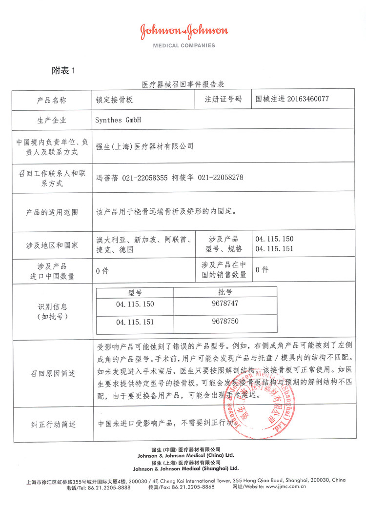 强生(上海)医疗器材有限公司报告,该公司代理的锁定接骨板(注册证编号:国械注进20163460077),由于以上产品的型号标注有误,其生产商Synthes GmbH对该产品进行主动召回。该公司称本次召回产品未在中国销售。请各省、自治区、直辖市食品药品监督管理局加强对此类产品的监督管理。