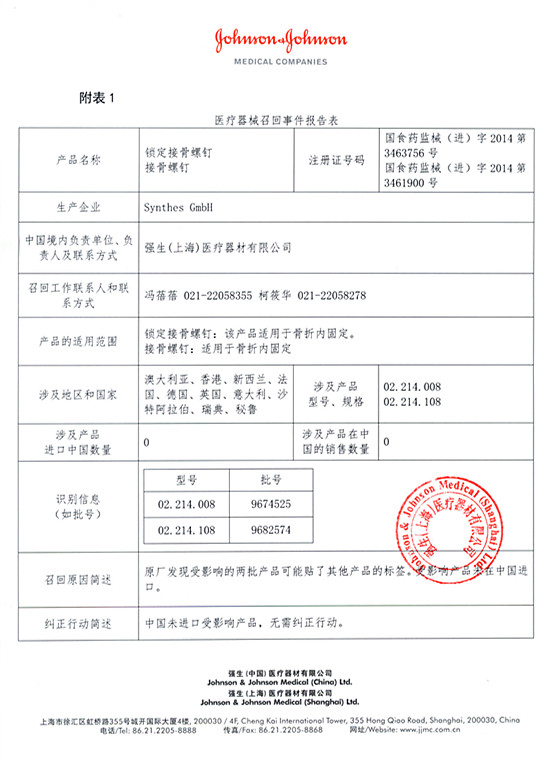 强生(上海)医疗器材有限公司报告,该公司代理的锁定接骨螺钉(注册证编号:国食药监械(进)字2014第3463756号)和接骨螺钉(注册证编号:国食药监械(进)字2014第3461900号),由于以上产品使用了错误的标签,其生产商Synthes GmbH对该产品进行主动召回。该公司称本次召回产品未在中国销售。请各省、自治区、直辖市食品药品监督管理局加强对此类产品的监督管理。