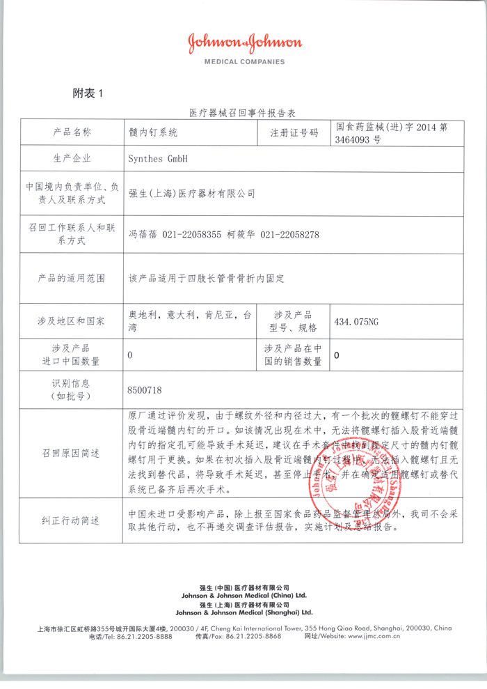 强生(上海)医疗器材有限公司报告,该公司代理的髓内钉系统(注册证号:国食药监械(进)字2014第3464093号),由于以上产品的螺纹外径和内径过大,其生产商Synthes GmbH对该产品进行主动召回。该公司称本次召回产品未在中国销售。请各省、自治区、直辖市食品药品监督管理局加强对此类产品的监督管理。