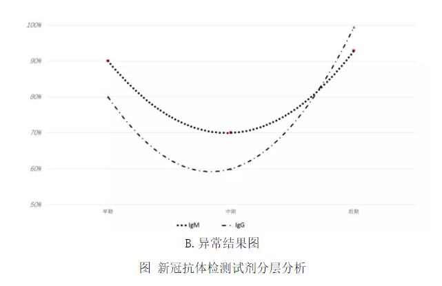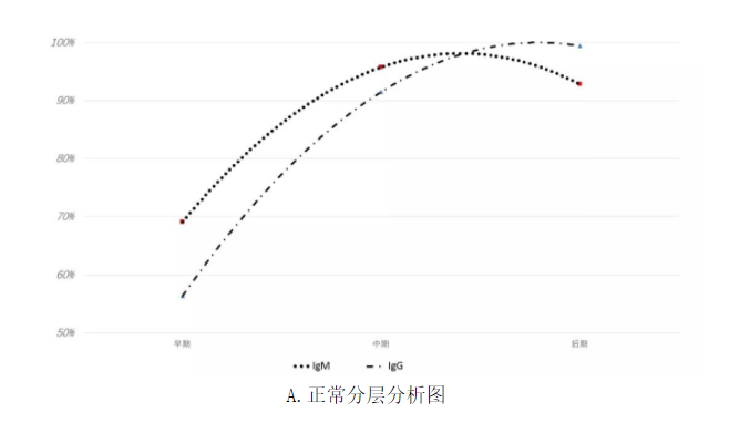 以上这个例子是在整体临床性能结果不好的情况下,为了解释结果所进行的混杂因素的分层分析。除此之外,在临床性能可接受时也需要进行分层分析,使临床试验的结果更加稳定。例如,在进行新冠抗体检测试剂临床性能评价时需根据受试者病程进行分层分析,其中发病0至7天为疾病早期,8到14天为疾病的中期,15天以后进入疾病的后期。在这个过程中,抗体水平会根据病程呈现相对固定的变化趋势。IgG抗体的水平会持续升高,IgM抗体水平会呈现疾病早期低、中期高、后期逐渐降低的趋势(如图A)。我们在对于一个试剂的临床试验数据进行审评时发现,这个试剂所展现的抗体水平与所认知的一般性能完全不符,两种抗体水平均呈现早、晚高,中期低(如图B)。但这个试剂整体临床性能却相当不错。这是因为它入组了较多的早期和后期受试者,从而提高了整体临床性能数据。如果仅进行整体入组人群的灵敏度、特异度分析是很难发现这样的问题的。