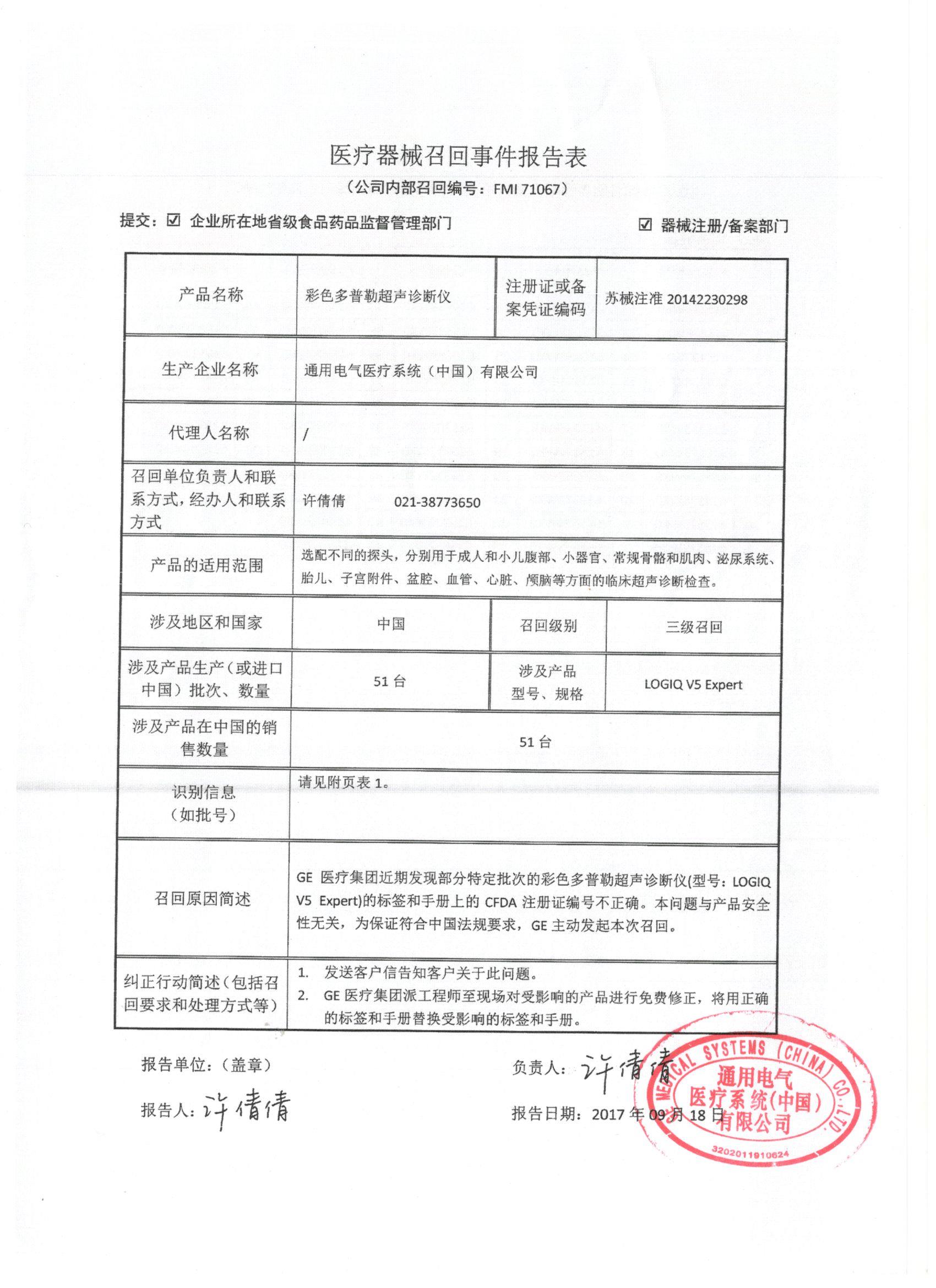 通用电气医疗系统(中国)有限公司报告,由于标签和手册上的医疗器械注册证编号不正确的原因,通用电气医疗系统(中国)有限公司对其生产的彩色多普勒超声诊断仪(注册号:苏械注准20142230298)进行主动召回。召回级别为三级。涉及产品的型号、规格及批次等详细信息见《医疗器械召回事件报告表》。