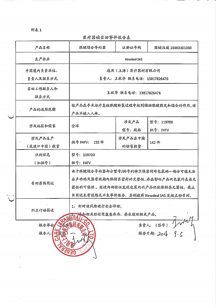 通用(上海)医疗器材有限公司对跟腱缝合导向器主动召回