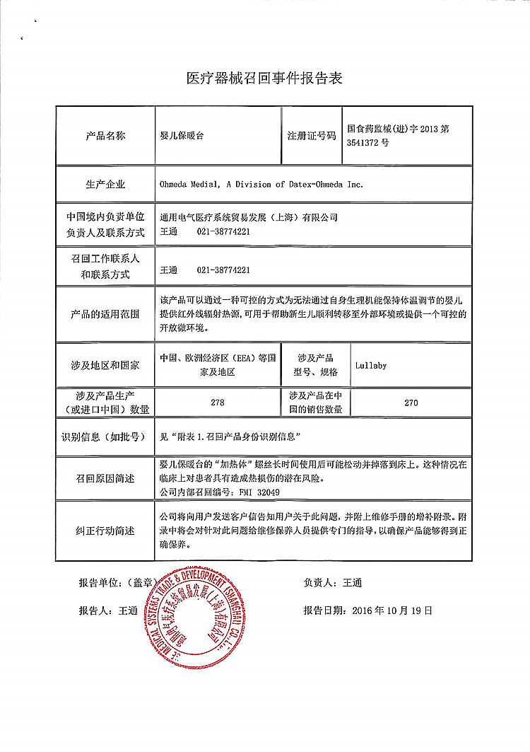 通用电气医疗系统贸易发展(上海)有限公司对婴儿保暖台主动召回