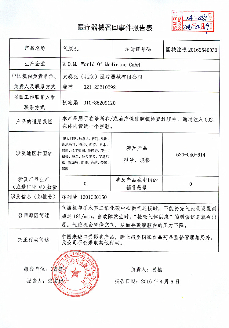 W.O.M.World Of Medicine GmbH对气腹机进行召回