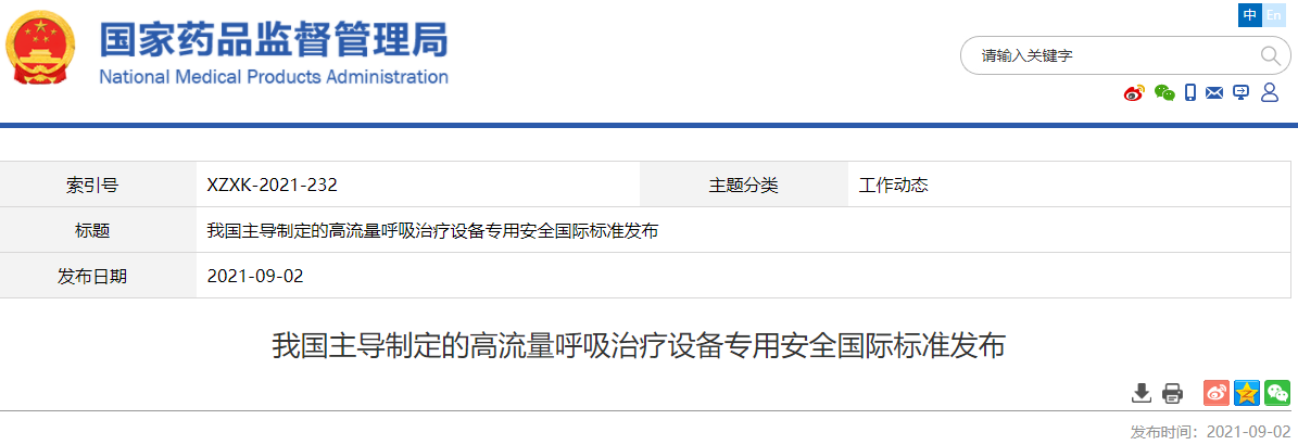 2021年8月30日,国际标准《医用电气设备 第2-90部分:高流量呼吸治疗设备的基本安全和基本性能专用要求》,由国际标准化组织(International Organization for Standardization,ISO)和国际电工委员会(International Electrotechnical Commission,IEC)官网发布(标准号:ISO 80601-2-90:2021),这是由我国提出并负责完成的首个新冠肺炎疫情防控医疗器械国际标准项目。
