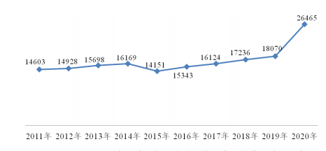 图 2-1 2011-2020 年医疗器械生产企业数量变化趋势 单位:家