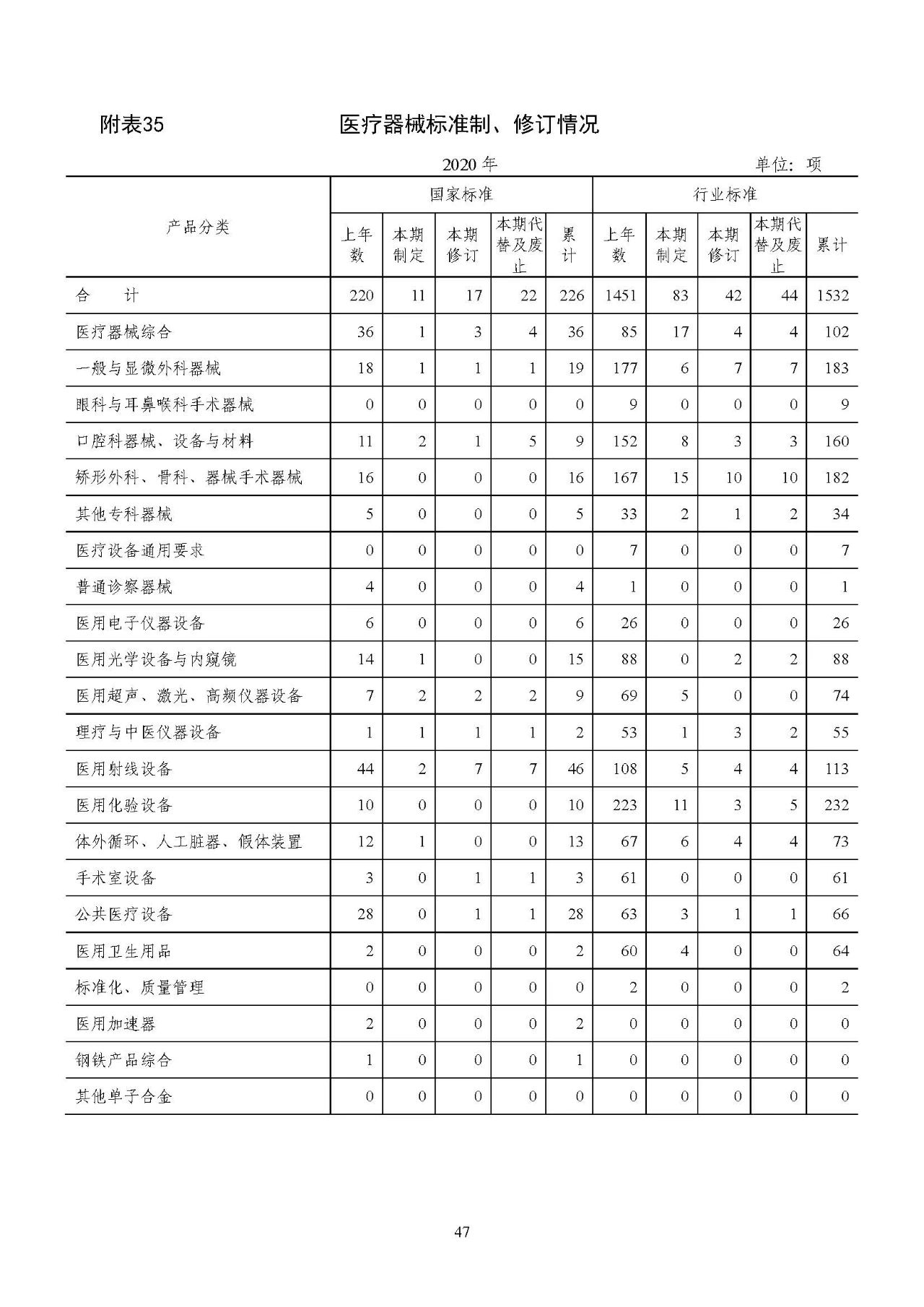 2020 年医疗器械国家标准制、修订工作中,制定 11 项,修订17 项,代替及废止国家标准 22 项;行业标准制、修订工作中,制定 83 项,修订 42 项,代替及废止行业标准 44 项。截至 2020 年底,我国共有医疗器械标准 1758 项,其中国家标准 226 项,行业标准1532 项。详见附表 35。