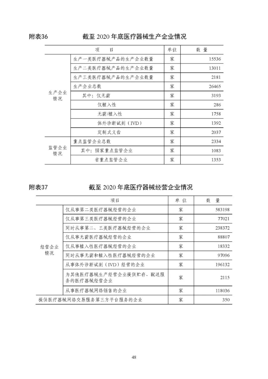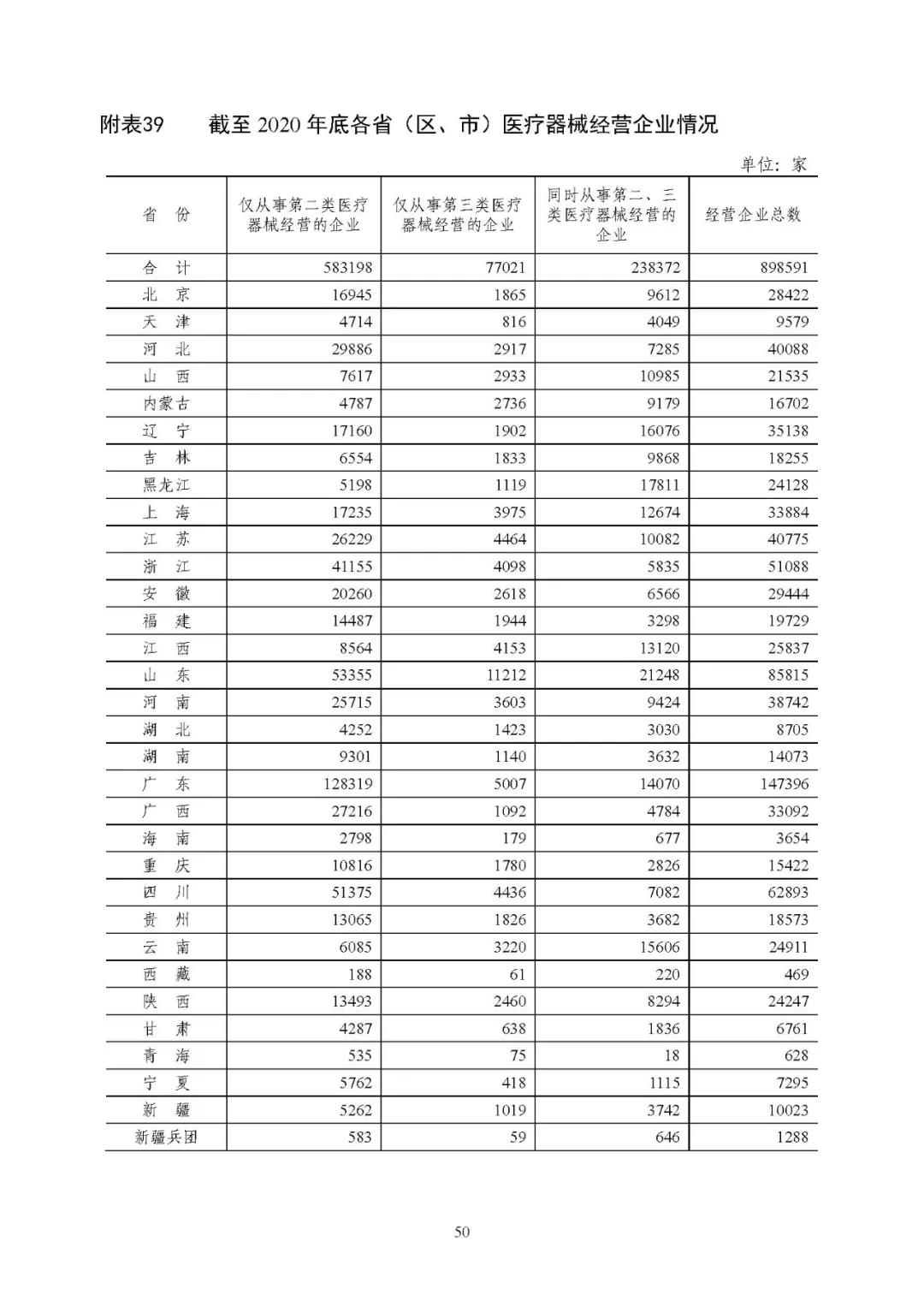 截至 2020 年底,全国共有二、三类医疗器械经营企业 89.86 万家,其中,仅经营二类医疗器械产品的企业 58.32 万家,仅经营三类医疗器械产品的企业 7.70 万家,同时从事二、三类医疗器械经营的企业 23.84 万家。详见附表 37、39。