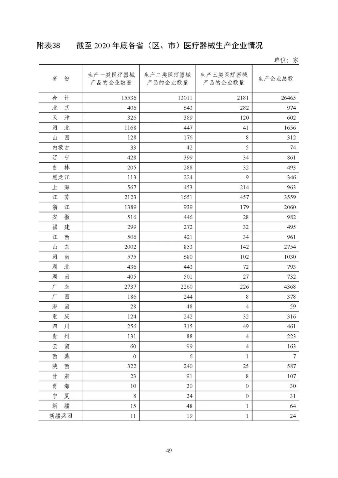 截至 2020 年底,全国实有医疗器械生产企业 2.65 万家,其中(同时生产一类、二类或三类产品的企业,统计时分别计为一类生产企业、二类生产企业和三类生产企业,企业总数仅计一家):可生产一类产品的企业 1.55 万家,可生产二类产品的企业 1.30 万家, 可生产三类产品的企业 2181 家。详见附表 36、38。