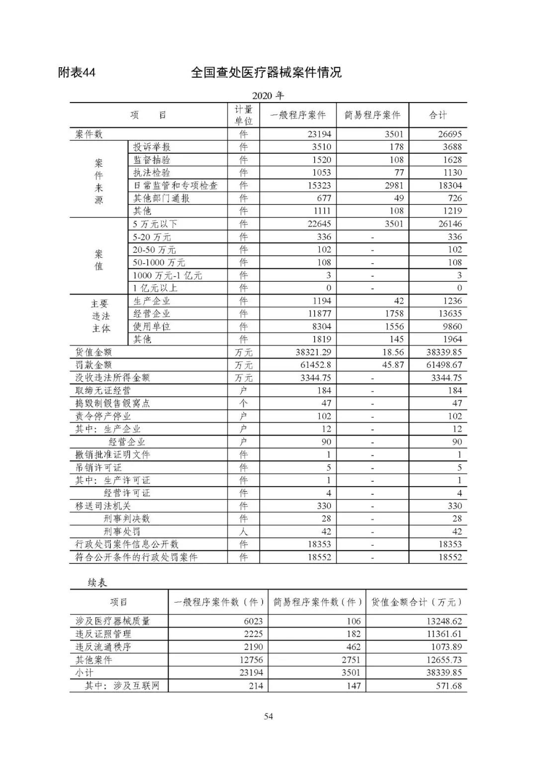 2020 年查处医疗器械案件 2.67 万件,同比增加 73.65%,货值金额 3.83 亿元,同比增加 252.37%。查处医疗器械案件数量前 5 位 的省份为:河南、河北、山东、四川、湖南。详见附表44、45。