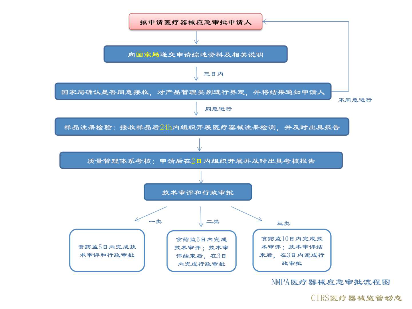 应急审批时限:24h内开展注册检验,5个工作日内完成技术审评,同步开展体系核查和现场检查,1个工作日内完成行政审批。