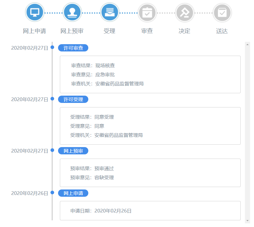 应急审批并不能豁免注册检验、体系核查和技术审评,仍需要按照流程办理,但这三项可同步进行,从而压缩整个注册周期。以最近在安徽省药监局申报的一次性使用医用口罩的应急审批为例,进度如图3所示,2月26日网上提交电子资料,2月27日通过网上预审和许可受理,在2020年02月29日接受现场体系核查。为了加快进度,先安排样品送检进行注册检测,在2月24日送检,检验周期在10-20个工作日。纵观注册检验、技术审查、体系核查的周期,正好在产品检验期间完成技术审查和体系核查。