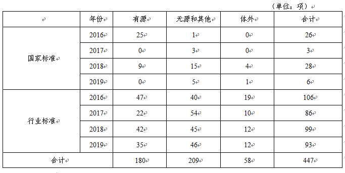 截至2019年底,“十三五”规划中500项医疗器械标准制修订任务已立项447项,已完成89.4%(表1)。2019年共发布国家标准5项、行业标准72项以及行业标准修改单3项,医疗器械标准共计1671项(表2),医疗器械标准技术体持续优化。