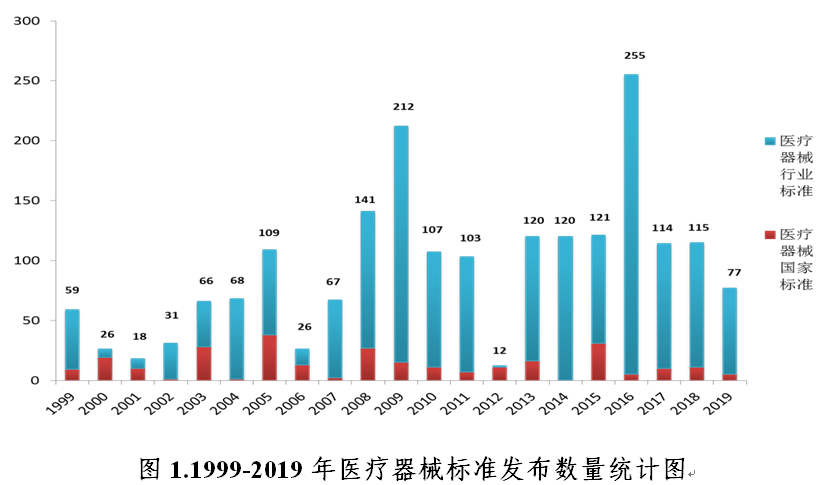 (一)标准数量稳步增长。“十五”“十一五”和“十二五”期间分别发布医疗器械标准292项、553项和476项。“十三五”即将收官,截至2019年底,已发布医疗器械标准共561项,自1999年-2019年20年来医疗器械标准发布数量稳步增长(图1)。经历了起步发展期和高速度增长期后,医疗器械标准技术体系从体量上已基本满足监管和产业发展需求,随着科技进步、产业发展和监管理念的转变,医疗器械标准已走上质量效率并重的集约型发展道路。