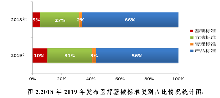 (四)标准约束力更加优化。截至2019年底,医疗器械强制性标准共395项,其中国家标准85项,行业标准310项。2019年国家药品监督管理局根据国务院强制性标准整合精简结论,发布《关于〈医用诊断X射线辐射防护器具 第1部分:材料衰减性能的测定〉等40项强制性医疗器械行业标准转化为推荐性行业标准的公告》(2019年第106号),转化为推荐性的40项标准中,产品标准23项(占57.5%),方法标准7项(占17.5%),管理标准1项(占2.5%),基础标准9项(占22.5%),医疗器械标准技术体系进一步优化。