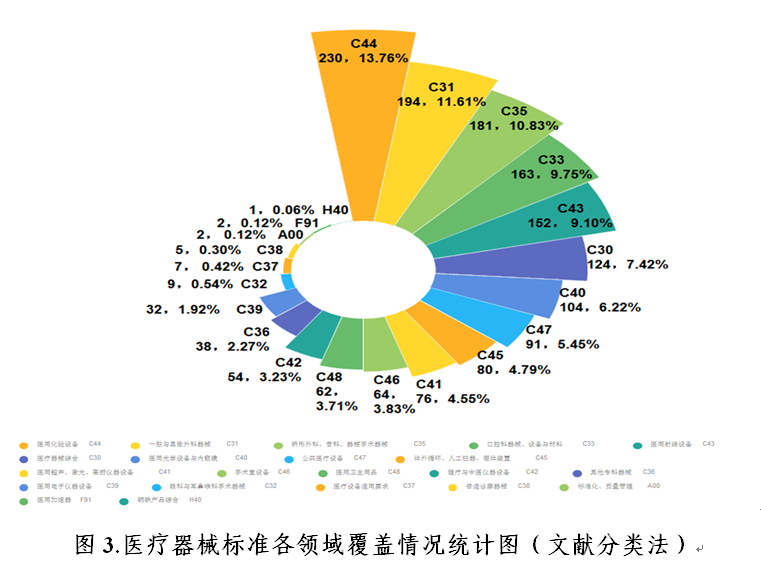 (三)标准覆盖面更加全面。医疗器械标准基本覆盖医用电气设备、手术器械、外科植入物等医疗器械各技术领域。按照《中国标准文献分类法》,医疗器械标准主要归类在C30至C49之间,C10和C30代表医药和医疗器械综合,其他代号指代的领域多为具体的产品领域。从现有医疗器械标准领域分布情况看,占比前5位的分别是:医用化验设备(C44)13.8%,一般与显微外科器械(C31)11.6%,矫形外科、骨科器械(C35)10.8%,口腔科器械、设备与材料(C33)9.8%,医用射线设备(C43)9.1%(图3)。