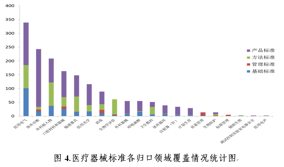 按照标委会(技术归口单位)归口领域,标准数量排名前5位的分别是:医用电气设备领域339项(20.3%),体外诊断领域243项(14.5%),外科植入物领域209项(12.5%),口腔材料和器械163项(9.8%)和输液器具领域148项(8.9%)。在各归口领域中,根据不同领域的标准需求,标准类别有所不同,医用电气设备、呼吸麻醉领域的基础标准占比较高,均达29.0%;医疗器械标准管理和质量管理领域的管理标准占比最高,分别为100%和85.7%;医疗器械生物学评价领域的方法标准占比最高,达90.2%;计划生育和体外诊断医疗器械领域的产品标准占比最高,分别为86.2%和86.0%(图4)。