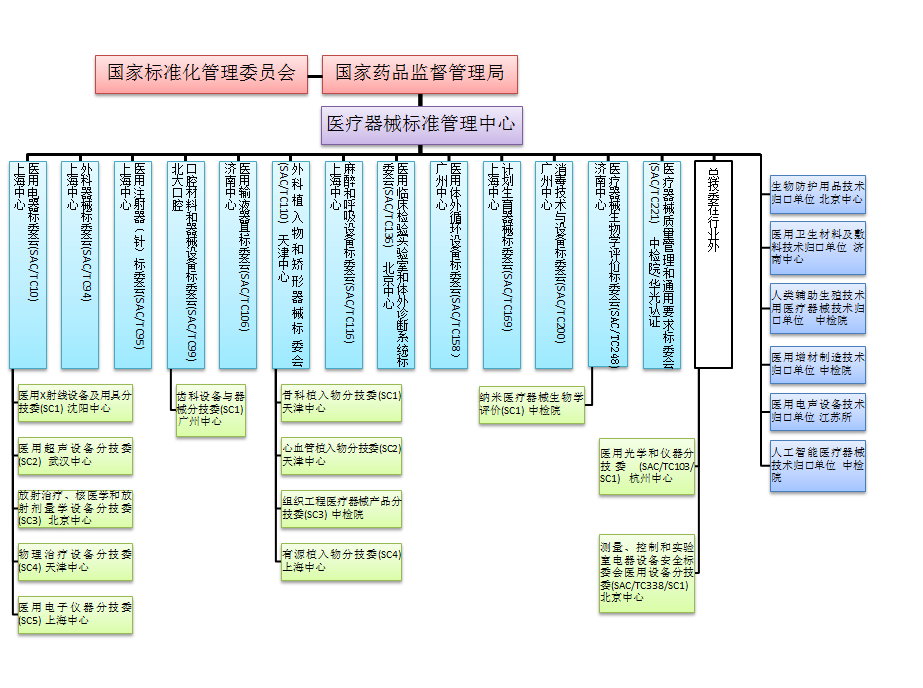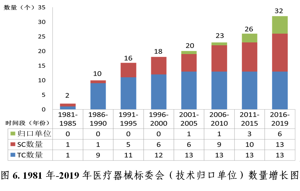 从1980年第一个医疗器械标准化技术委员会成立以来,经过40年的发展,标委会(技术归口单位)数量已逐步增长到32个(13个总技委、13个分技委和6个技术归口单位,图6),医疗器械标准工作领域不断拓展,医疗器械标准组织架构进一步完善(图7),有利于充分发挥新形势下医疗器械标准的引领作用和技术支撑作用。