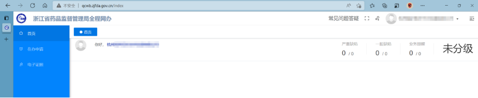 使用原浙江省药品监督管理局行政审批系统的账号密码登录,全程网办系统不需要使用UKey识别账号登录,可直接输入账号以及密码登录系统。大多数企业账号为SQ或JQ开头的,如SQ33000001。若使用原密码登录提示密码错误的,可将账号作为密码尝试是否能登入系统,如账号:SQ33000001,密码:SQ33000001。如果还是登录不了系统,可电话0571-88903259,或qq1611607245、3148183981联系查询账号密码。登入系统后界面如下。