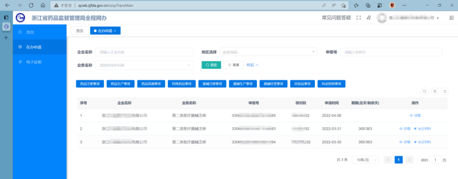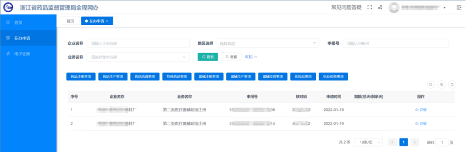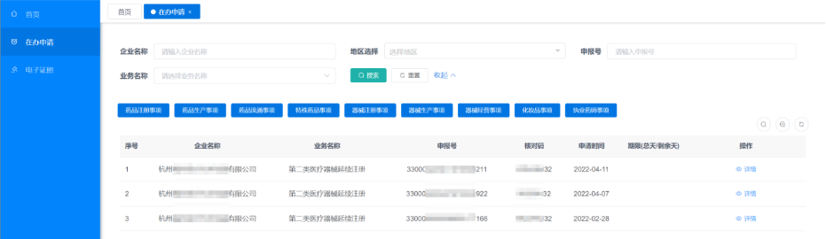 点击左侧菜单【在办申请】进入查看当前申报的办件,列表会展示当前正在办理的所有企业申请,通过点击详情进入查看。