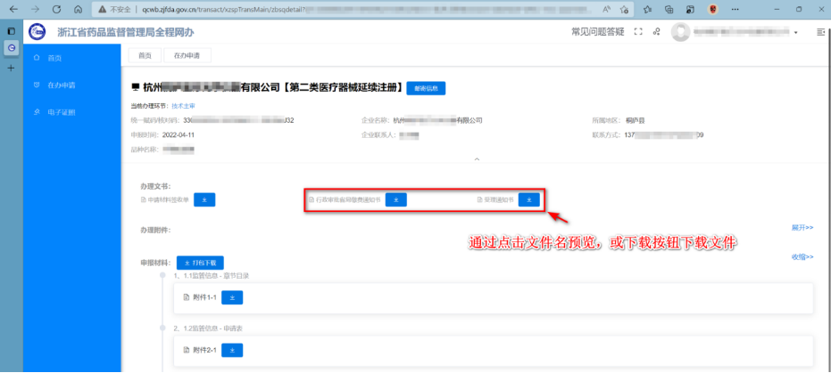 点击“查看”按钮进入办件详情页,在此界面就可查看/下载相应的受理通知书或者缴费通知书。