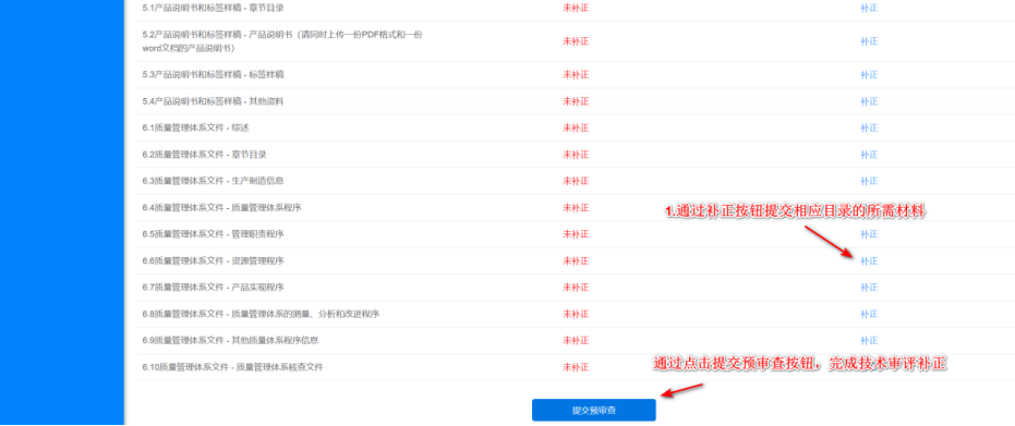 补正材料准备好之后,可登录系统在【在办申请】菜单,通过点击“补正材料”按钮进入材料提交页,通过点击各目录右侧“补正”按钮提交相应文件材料,待材料全部上传完成后,点击页面下方“提交预审查”按钮将电子资料上报给主审。