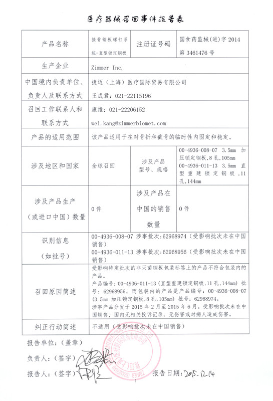 捷迈(上海)医疗国际贸易有限公司报告,该公司代理的接骨钢板螺钉系统-直型锁定钢板(注册证编号:国食药监械(进) 2014第3461476号),由于以上产品存在与标签不符的情况,生产商Zimmer Inc.对该字产品进行主动召回。该公司称本次召回产品未在中国销售。请各省、自治区、直辖市食品药品监督管理局加强对此类产品的监督管理。