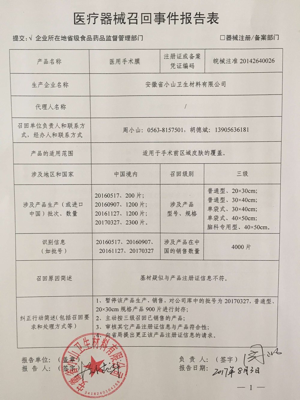 8月29日,总局发布了10条医疗器械产品召回信息,30日,再发两条召回信息。此次是安徽省小山卫生材料有限公司召回医用手术膜,以及西门子(深圳)磁共振有限公司召回医用血管造影X射线机。