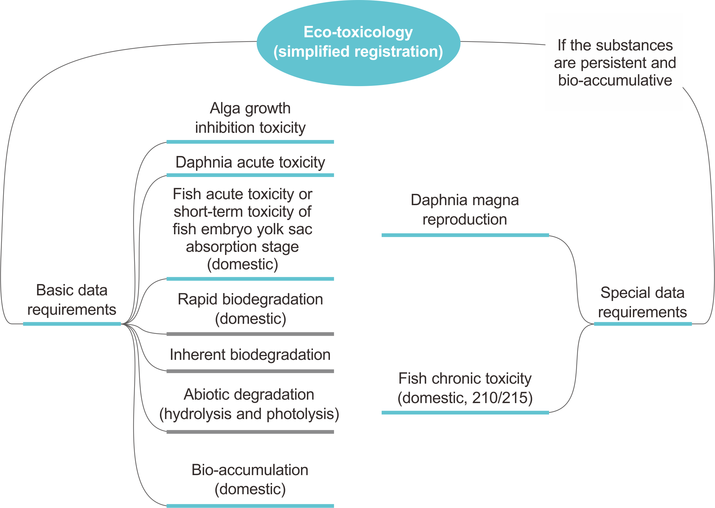 - Simplified Registration (1 t/a or more, yet less than 10t/a): Basic data includes physicochemical properties, persistence, bio-accumulation and acute toxicity of aquatic environment; If the substances are considered persistent and bio-accumulative, then additional data for chronic toxicity of aquatic environment is also required.