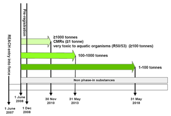 Les substances de phase-in (substances existantes) bénéficient de délais d'enregistrement prolongés si elles sont pré-enregistrées avant décembre 2008. Plus le tonnage est élevé, plus la date limite d'enregistrement est précoce.