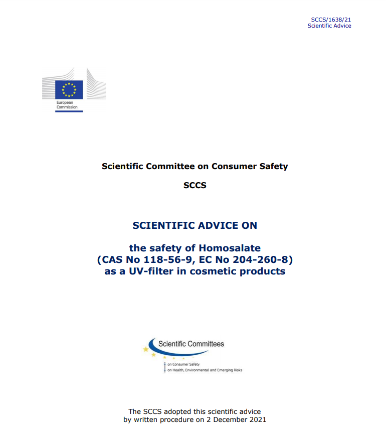 SCCS于2021年12月再次发布关于胡莫柳酯作为UV防晒剂在化妆品中使用安全性的科学建议SCCS/1638/21。文件中指出,依据安全评估并考虑潜在内分泌干扰特性,胡莫柳酯(Homosalate)作为UV防晒剂在面霜和泵喷雾中的浓度为7.34%是安全的。