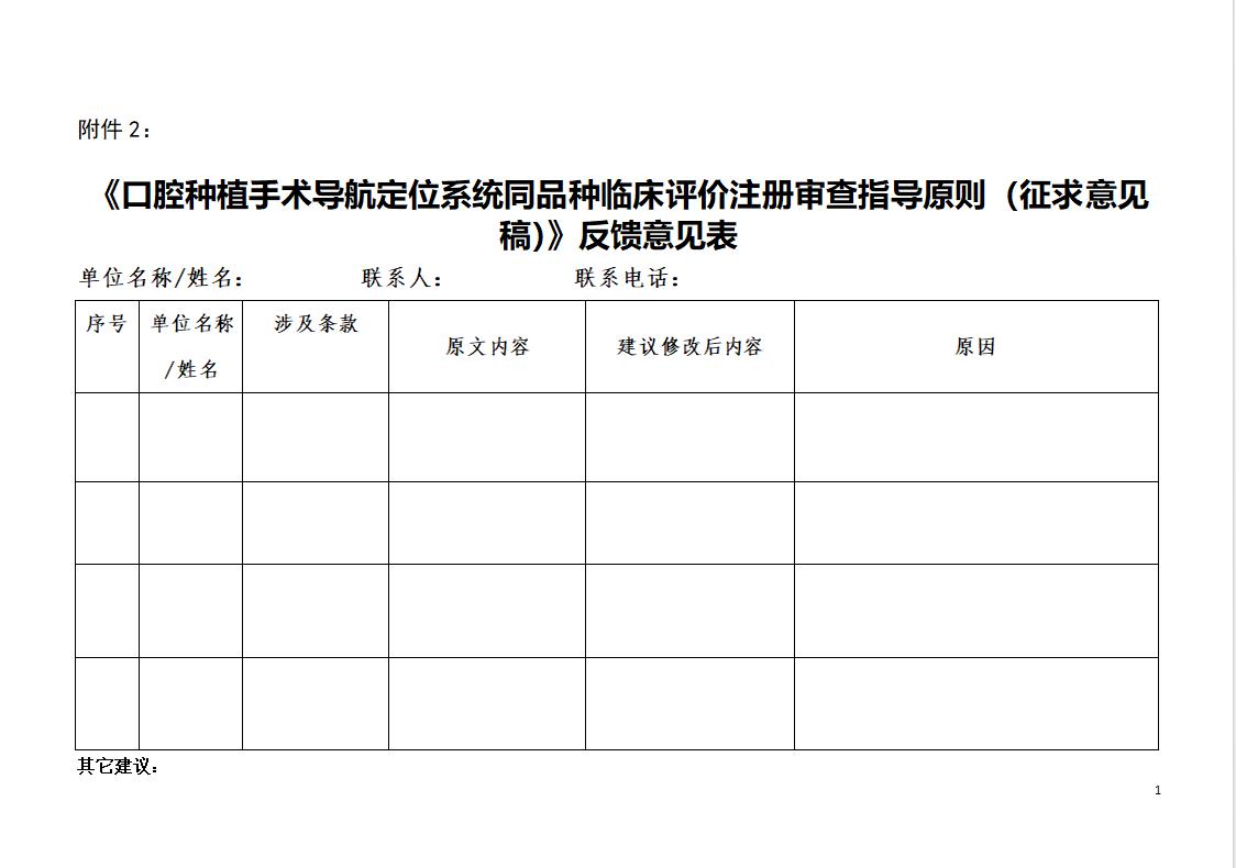 如有任何意见或建议,请下载并填写附件中的《口腔种植手术导航定位系统同品种临床评价注册审查指导原则(征求意见稿)》反馈意见表,并于2021年10月17日前将反馈意见以电子邮件形式反馈我中心。