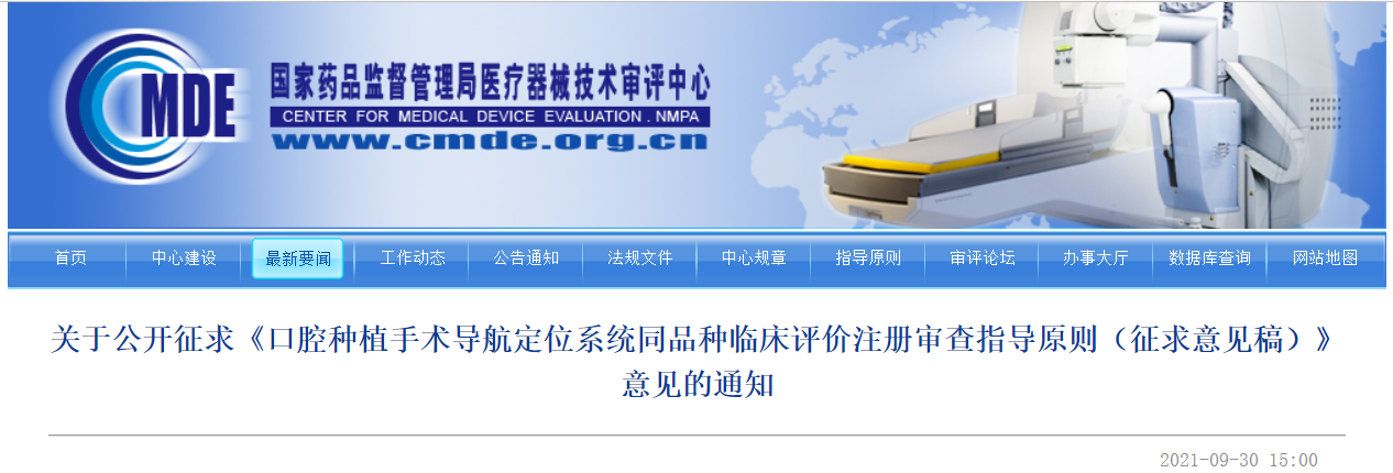 为明确口腔种植手术导航定位系统的同品种临床评价要求,统一审评尺度,我中心经调研讨论,起草了《口腔种植手术导航定位系统同品种临床评价注册审查指导原则(征求意见稿)》。为使该指导原则更具有科学合理性及实际可操作性,即日起在我中心网上公开征求意见,衷心希望相关领域的专家、学者、管理者及从业人员提出意见或建议,推动指导原则的丰富和完善。
