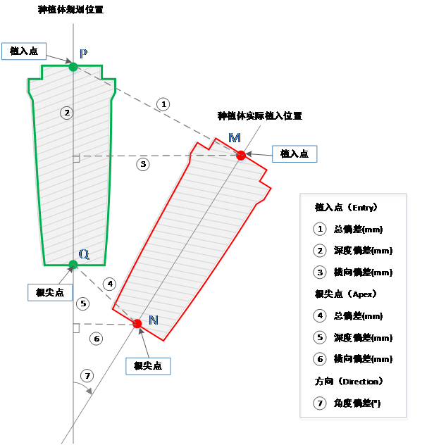 种植体植入精度具体参数定义可参考图1或其他临床公认的方式确定。图1所示的左侧为种植体术前计划位置,右侧为种植体实际植入位置,根据两组位置的植入点和根尖点的空间坐标即可求得种植体植入点的总误差、深度误差、横向误差,种植体根尖点的总误差、深度误差、横向误差,以及种植体的角度误差。