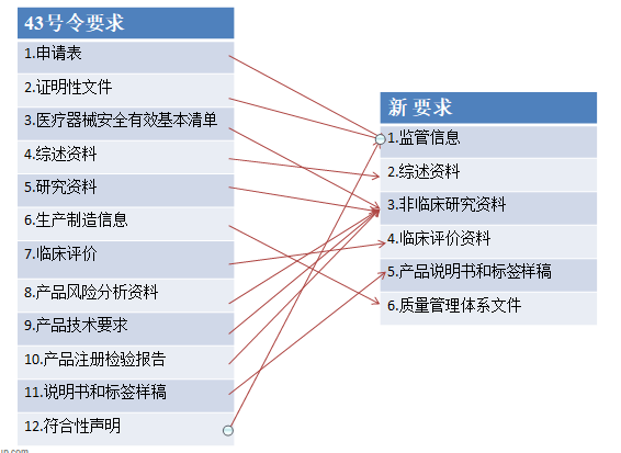 新发布的医疗器械注册申报资料从形式上与原43号令相比有了较大的变化,由原来的12大类资料修改为6类,对比关系详见下图。但从资料的内容上来说变化不大。
