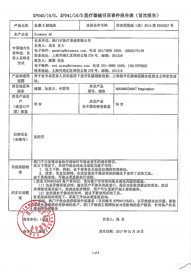 西门子医疗系统有限公司报告:企业发现涉及产品在执行活检时,系统可能会冻结且活检功能不可用。公司决定召回相关产品,本次召回级别II级,涉及产品的型号、规格及批次等详细信息见《医疗器械召回事件报告表》。