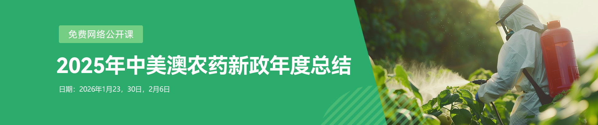 瑞旭集团将于2026年1月-2月每周五上午举办免费法规公开课,重点介绍2025年中国、美国和澳洲农药新规对行业的影响,帮助您从容应对以上国家的法规挑战。