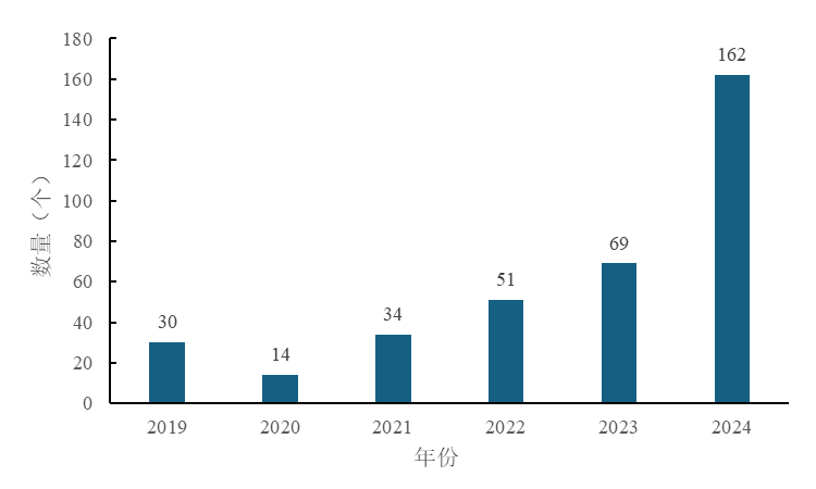 图1统计了从2019年到2024年6年间每年批准的原药(母药)登记数量。从2019年到2024年均是按照新农药资料要求批准的农药原药(母药),从图中可以看出,近5年新增的农药原药(母药)产品是逐年上升的,2024年登记数量高达162个。