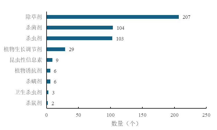 图2统计了2019-2024年中国农药原药(母药)类别登记数量。登记的类别除草剂仍占绝对优势,数量最多,其次是杀菌剂,紧接着是杀虫剂和植物生长调节剂。