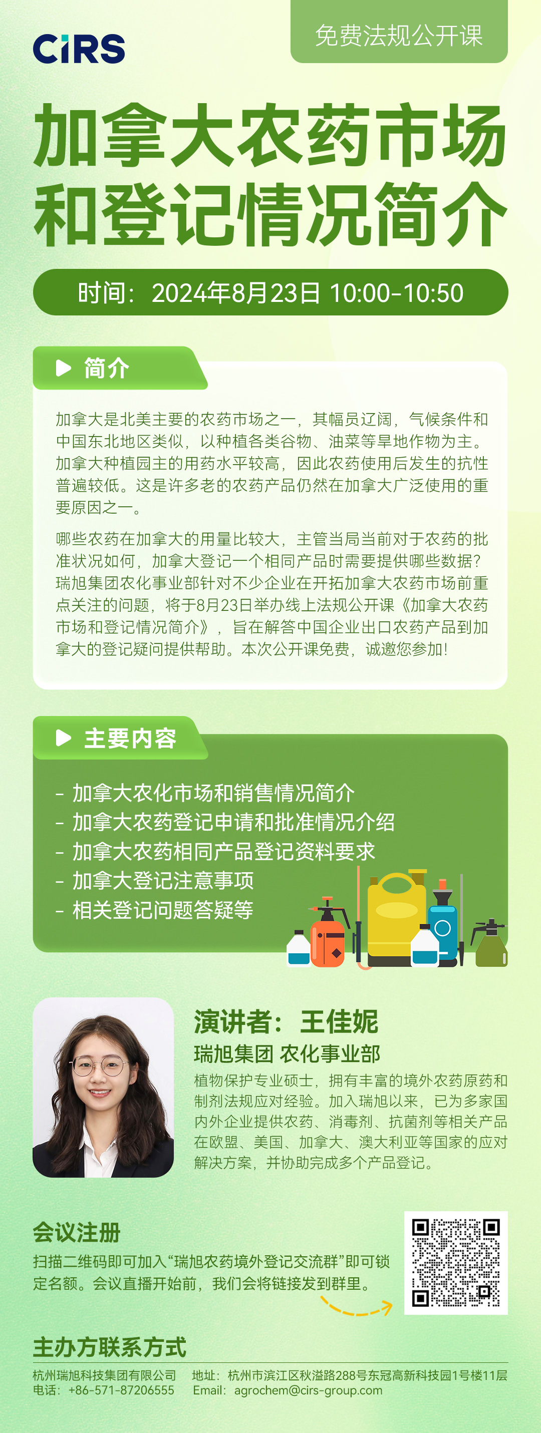 中文 | 2024年8月23日 | 10:00 -10:40 AM | 加拿大农药市场和登记情况简介 王佳妮 女士 瑞旭集团农化事业部 |