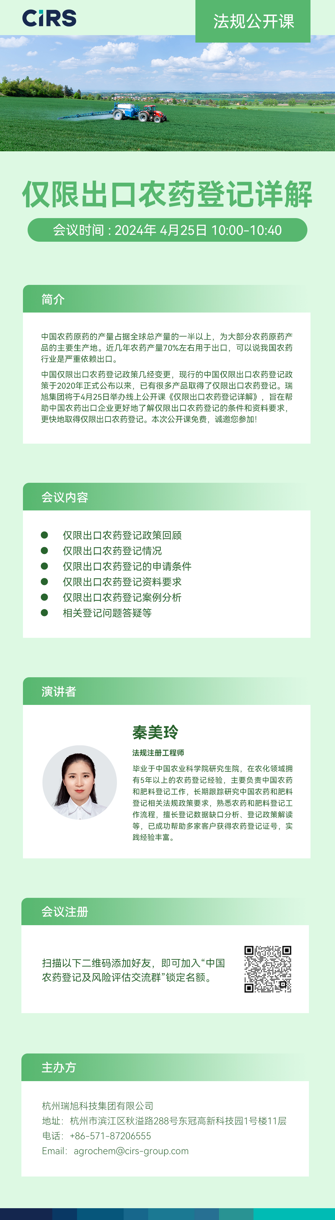 中文 | 2024年4月25日 | 10:00 -10:30AM | 仅限出口农药登记详解 秦美玲女士 瑞旭集团农化事业部 |
