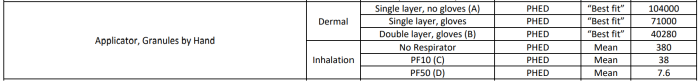 由于PHED数据库是用很老的编程语言编写的,故美国EPA发布了PDF版的农药风险评估的单位暴露替量替代参考表(Occupational Pesticide Handler Unit Exposure Surrogate Reference Table),记录了各种处理和施用场景下的农药单位暴露量。