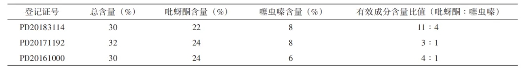 截至2024年8月,已登记的噻虫嗪·吡蚜酮悬浮剂产品共有3个(表2),从混配制剂产品配比看,已有配比分别为11∶4、3∶1和4∶1,其中11∶4的配比与3∶1的配比梯度不符合现行要求,但在计算产品配比个数时,需要计算在内,因此该剂型产品的混配产品配比梯度已满3个,不能新增新配比。已有的3个不同配比含量均为1个,各个配比还可以新增2个新含量。新增含量应符合《农药登记资料要求》(附件12)规定。