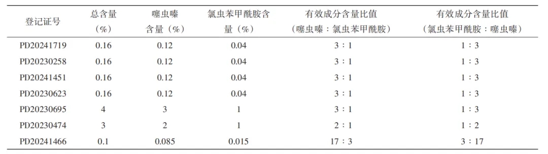 截至2024年8月,已登记的噻虫嗪·氯虫苯甲酰胺颗粒剂产品共有7个(表1),从混配制剂产品配比看,已有配比(噻虫嗪∶氯虫苯甲酰胺)分别为3∶1、2∶1、17∶3,则噻虫嗪·氯虫苯甲酰胺颗粒剂产品3个配比已满,不能新增不同配比的产品;从相同配比不同含量梯度看,配比为3∶1的噻虫嗪·氯虫苯甲酰胺颗粒剂产品已有含量梯度0.16%和4%,未满3个含量梯度,还可以新增1个新含量,配比为2∶1和17∶3的噻虫嗪·氯虫苯甲酰胺颗粒剂产品仅有1个含量,分别为3%、0.1%,那么配比为2∶1和17∶3的噻虫嗪·氯虫苯甲酰胺颗粒剂产品还可以分别新增2个新含量。新增含量应符合《农药登记资料要求》(附件12)规定。