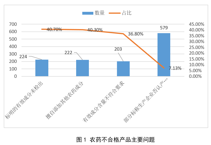 近日农业农村部办公厅发布了关于2018年全国农药监督抽查结果的通报。本次抽查按照“双随机一公开”的要求,采取例行抽查、重点抽查、专项抽查的方式抽取农药样品,重点抽样检测了蔬菜、果树、茶树、水稻、小麦、玉米、棉花、大豆等作物用药,涉及29个省(区、市)和境外生产企业的8119个农药样品,其中质量合格样品7568个,占比93.2%;不合格样品551个,占比6.8%。不合格样品中检出假农药(标明的有效成分未检出或擅自加入其他农药成分)370个,占检测样品总数的4.6%,占不合格样品的67.2%。不合格农药产品主要存在以下问题:(1)标签中标明的有效成分未检出;(2)擅自添加其他农药成分,甚至添加高毒农药、百草枯等;(3)有效成分含量不符合要求;(4)部分标称生产企业否认产品由其生产。具体分析见图1。