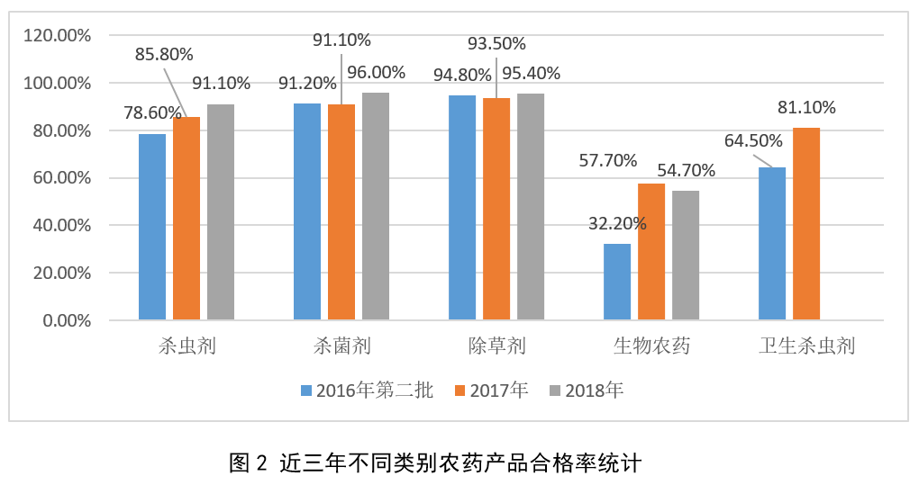 农药监督抽查作为农药产品市场监管的有效措施,在确保农作物重大病虫害有效防治,保障农药质量安全以及农产品质量安全等方面,发挥着重要的作用。近几年来,由于行政审批制度变革,监管重心从“重审批、轻监管”转向“宽准入、严监管”,执法部门对农药产品的监督抽查力度也在不断加大。2016年抽检农药样品5475个,合格样品4695个,合格率85.8%,不合格样品780个,不合格率14.2%;2017年抽检农药样品5029个,合格样品4472个,合格率为88.9%。不合格样品557个,不合格率为11.1%。通过与2018年的抽检结果比较,可以发现农药产品的合格率近三年在逐年提高。瑞旭集团同时整理了近三年不同类别农药产品,如杀虫剂、杀菌剂、除草剂、生物农药、卫生杀虫剂产品的合格率数据,详情见图2,发现同类产品合格率也呈上升趋势。